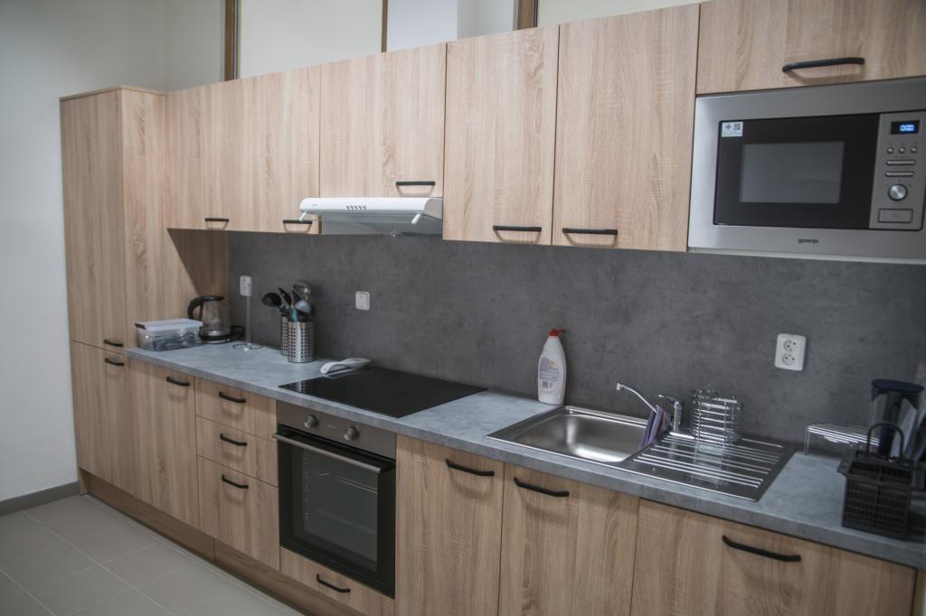 Součástí pronájmu je kuchyňka vybavená dřezem, myčkou na nádobí a úložnými prostory pro vaše občerstvení. Samozřejmostí jsou toalety a šatna pro hosty.